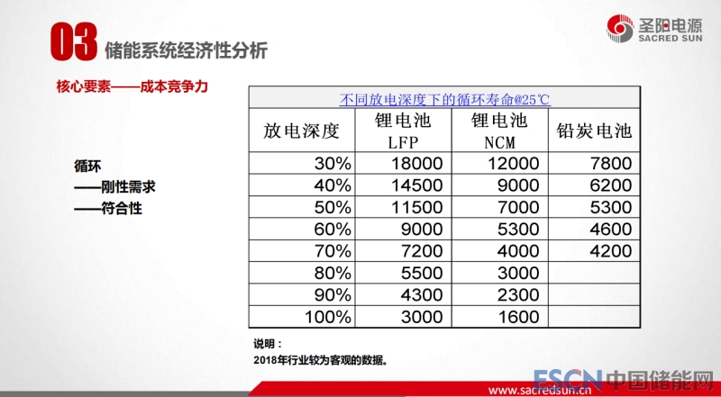 從這個(gè)圖來看,從電池本身的屬性來說,無論鋰電池還是鉛電池,70%的循環(huán)從整個(gè)壽命期來說輸出能量還是很高的,但是上午大家提到了,實(shí)際上電池用與不用本身存在一個(gè)日歷壽命,一年做700次,十年七千次,如果我們做到一萬多次,可能日歷壽命12年左右就到了,當(dāng)然未來日歷壽命會有改進(jìn)和改善。從當(dāng)前的情況來說,實(shí)際上60%以下的循環(huán)壽命是不推薦的,這也是目前在鋰電池的儲能系統(tǒng)里面在90%左右的標(biāo)底,一個(gè)是來源于年度的收益壓力,80%這個(gè)對收益的影響非常直觀、快捷。第二個(gè)存在很大的不確定性,本來你80%很好,但是到5年以后計(jì)劃不如變化快,還不如早點(diǎn)收回成本。