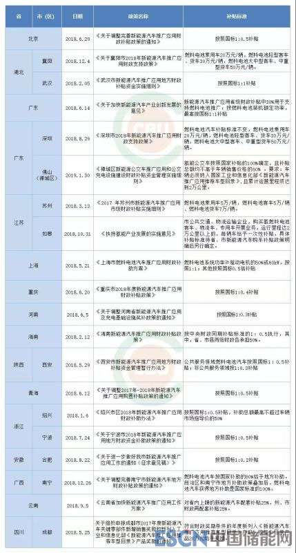 2018年全國部分省市燃料電池汽車補貼標(biāo)準(zhǔn)