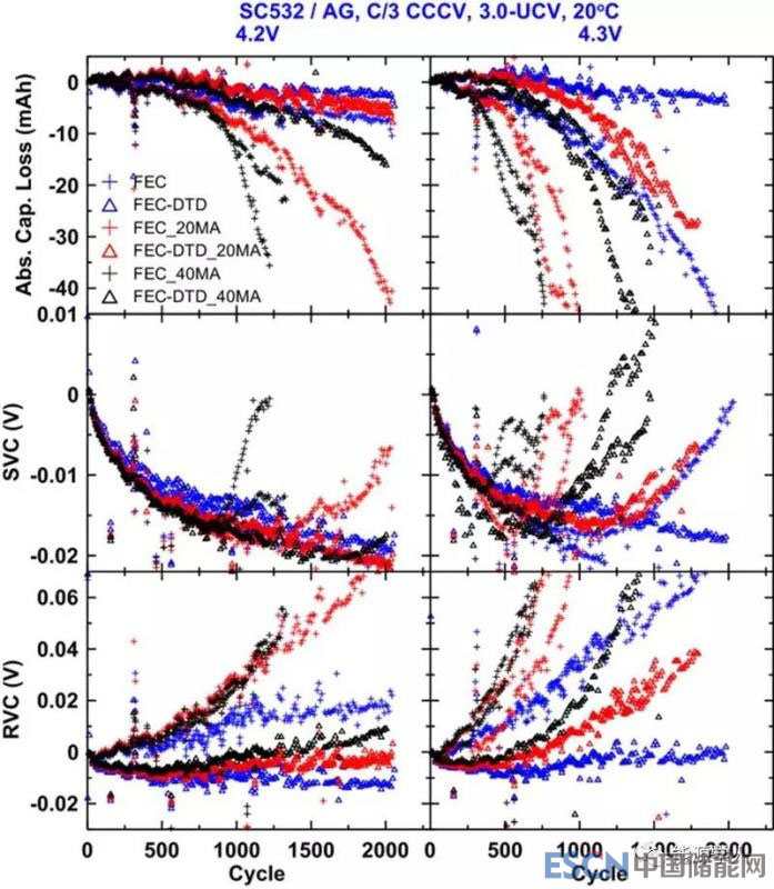 上圖5為不同電池在循環(huán)中,容量損失、SVC、RVC等參數(shù)的變化,圖左列循環(huán)到4.2V,右列循環(huán)到4.3 V,在4.2 V下測(cè)試的電池的初始容量接近210 mAh,在4.3 V下測(cè)試的電池的初始容量接近225 mAh。藍(lán)色十字表示FEC,藍(lán)色三角形表示FEC-DTD,用顏色表示MA含量:藍(lán)色為無(wú)MA,紅色為20 MA,黑色為40 MA。從圖上看,循環(huán)至4.2V的電池比循環(huán)至4.3V的電池具有更好的容量保持能力和更小的阻抗增長(zhǎng),且較高的MA含量導(dǎo)致電池在長(zhǎng)期使用中急劇衰減,而DTD可顯著降低阻抗增長(zhǎng)和延長(zhǎng)壽命。