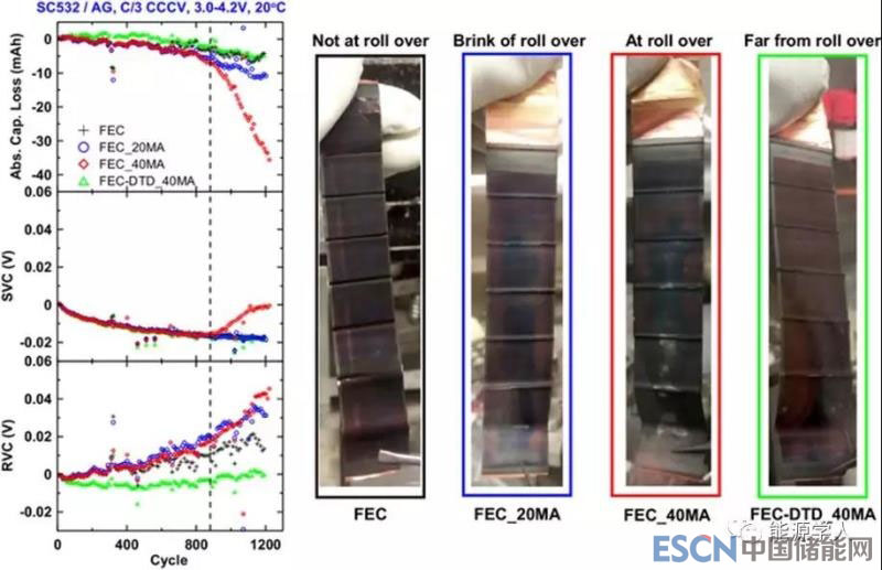 上圖6為標(biāo)準(zhǔn)長(zhǎng)期循環(huán)下的ΔV、容量和SVC參數(shù)變化曲線,可以看出,對(duì)于FEC和FEC-DTD_20MA電池而言,SVC在1100到1200圈之間有明顯上升,表示著鍍鋰現(xiàn)象的發(fā)生。SVC的變化清楚地確定了鍍鋰的開(kāi)始時(shí)間的循環(huán)計(jì)數(shù),是一個(gè)非常重要的方法。