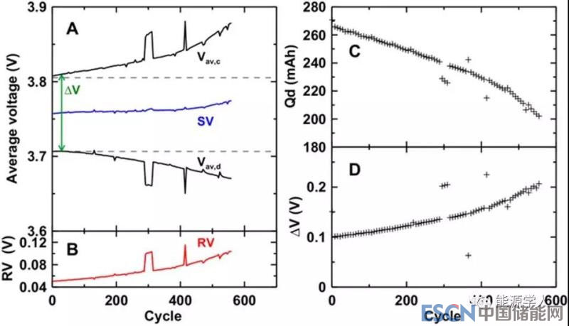 一個(gè)理想的鋰離子電池在其使用壽命中應(yīng)具有恒定的平均充電電壓(Vav,c)和恒定的平均放電電壓(Vav,d),但是,通常在長(zhǎng)時(shí)間循環(huán)后,Vav,c增加,Vav,d下降。