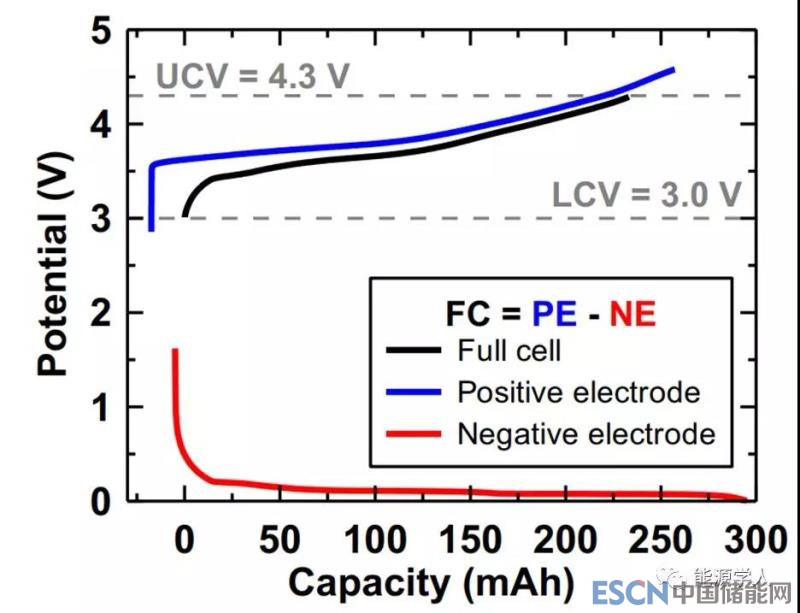 上圖1為全電池的首次電位-容量(V-Q)曲線,從圖中可以看出正、負(fù)電極對(duì)全電池V-Q曲線形狀的影響。一般來(lái)說(shuō),全電池的電位是正電極電位和負(fù)電極電位之間的差值。在本文中,全電池的電位最高不超過(guò)4.3 V(UCV),最低不低于3.0V (LCV),為了保持恒定的截止電位,UCV和LCV的位置會(huì)相對(duì)于容量軸移動(dòng),移動(dòng)的位置取決于電池阻抗增長(zhǎng)、鋰儲(chǔ)量損失和活性材料損失等多個(gè)因素。