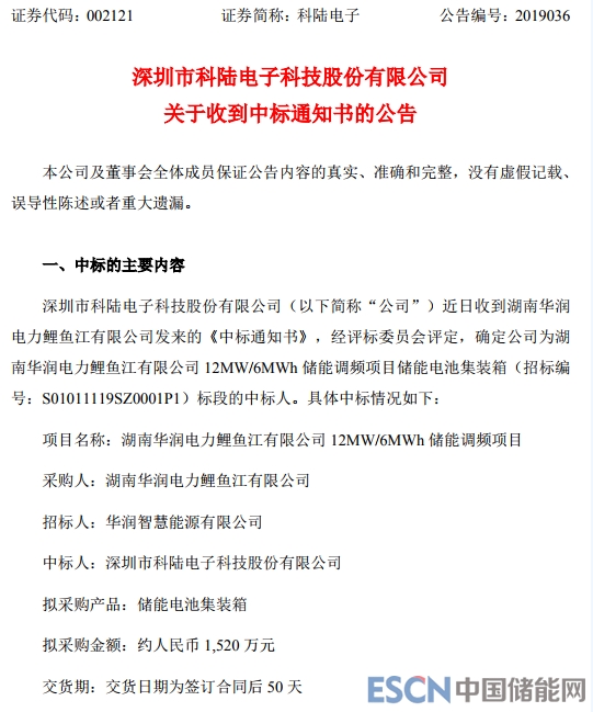 中國儲能網(wǎng)訊:科陸電子3月23日發(fā)布公告,近日收到湖南華潤電力鯉魚江有限公司發(fā)來的《中標通知書》,確定公司為湖南華潤電力鯉魚江有限公司12MW/6MWh儲能調頻項目儲能電池集裝箱標段的中標人,擬采購金額約人民幣1520萬元。