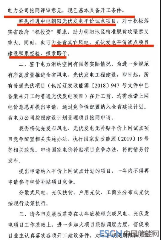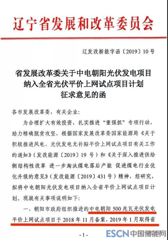 2019年3月22日,遼寧省下發(fā)的《關(guān)于中電朝陽光伏發(fā)電項目納入全省光伏平價上網(wǎng)試點項目計劃征求意見的函》中提到: