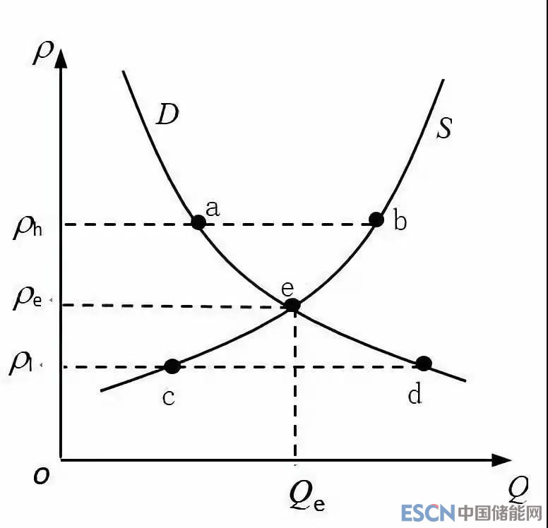用微觀經(jīng)濟(jì)學(xué)中經(jīng)典的供給與需求分析來說明市場(chǎng)機(jī)制及市場(chǎng)價(jià)格的決定。如圖3所示,假定決定供求的因素除商品自身的價(jià)格外其余均為已知,因而供求狀況確定。圖中曲線S表示供給曲線,曲線D表示需求曲線。由圖3可見,曲線S和D在e點(diǎn)相交,與e點(diǎn)相對(duì)應(yīng)的價(jià)格ρe就是均衡價(jià)格,或者叫市場(chǎng)出清價(jià)格。因?yàn)樵诖藘r(jià)格水平上,買方愿意并能夠購(gòu)買的數(shù)量與賣方愿意并能夠供給的數(shù)量恰好相等。所謂市場(chǎng)機(jī)制就是指在一個(gè)自由市場(chǎng)里能使價(jià)格得以變化一直達(dá)到出清(即供給量與需求量相等)的趨勢(shì)。