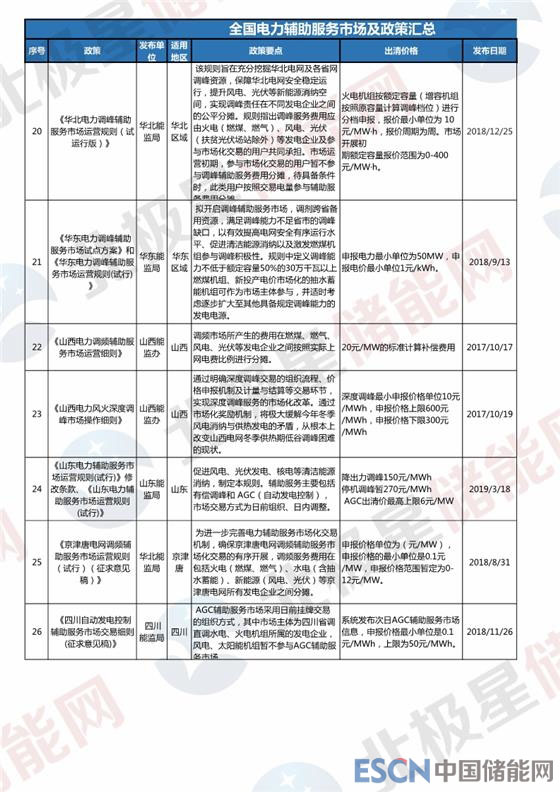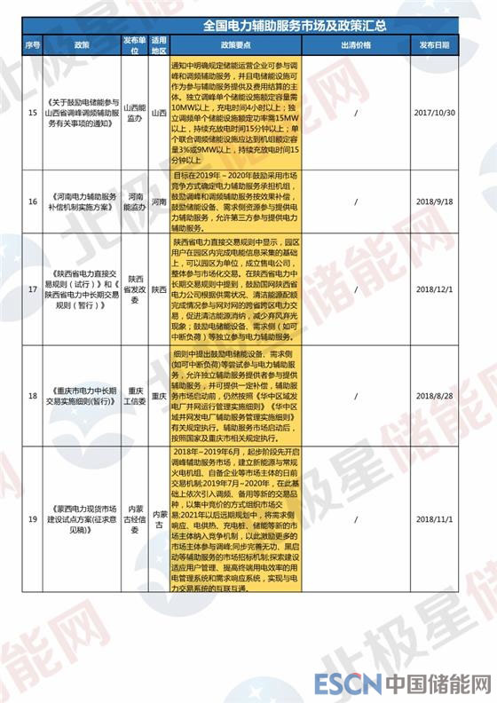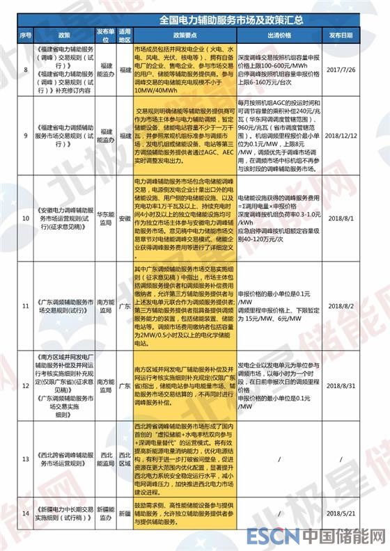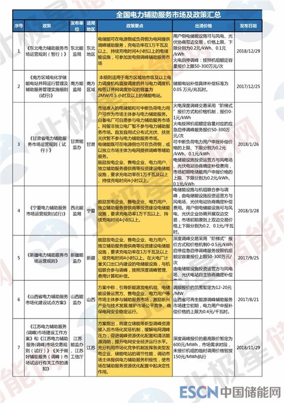 2017年國家能源局將東北、山西、福建、山東、新疆、寧夏、廣東、甘肅等8個地點作為第一批電力輔助服務市場試點,2018年多省陸續(xù)又發(fā)布了電力輔助服務市場開啟運營規(guī)則,儲能可參與的電力輔助服務市場范圍進一步擴大。