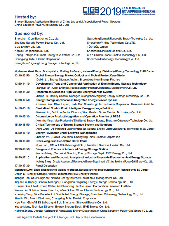 大會將設置開幕式暨中國儲能與電力體制改革、國際儲能與市場、儲能電站與技術應用(四個專場)、儲能成本與投融資、儲能電池與技術應用(兩個專場)、微電網(wǎng)與儲能、氫儲能與燃料電池、能源互聯(lián)網(wǎng)與多能互補、綜合能源服務、電動汽車與電網(wǎng)互聯(lián)、《2019儲能產(chǎn)業(yè)應用研究報告》發(fā)布等15個專場論壇。