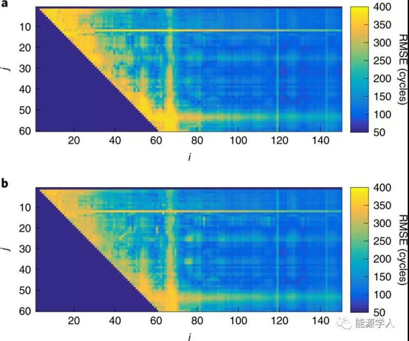 最后,作者還進(jìn)行了額外的分析,以了解在回歸設(shè)置中ΔQ(V)的特征選擇受周期指數(shù)的影響。作者研究了僅使用主要測(cè)試數(shù)據(jù)集的Qi(V) –Qj(V)方差單變量線性模型,如上圖所示。可以看出,該模型對(duì)i>60的索引方案不是很敏感,表明使用更早的周期進(jìn)行精確預(yù)測(cè)周期壽命是完全可能的。作者假設(shè),模型對(duì)索引方案的不敏感性意味著周期數(shù)的線性退化,而周期數(shù)通常為L(zhǎng)AM模式。