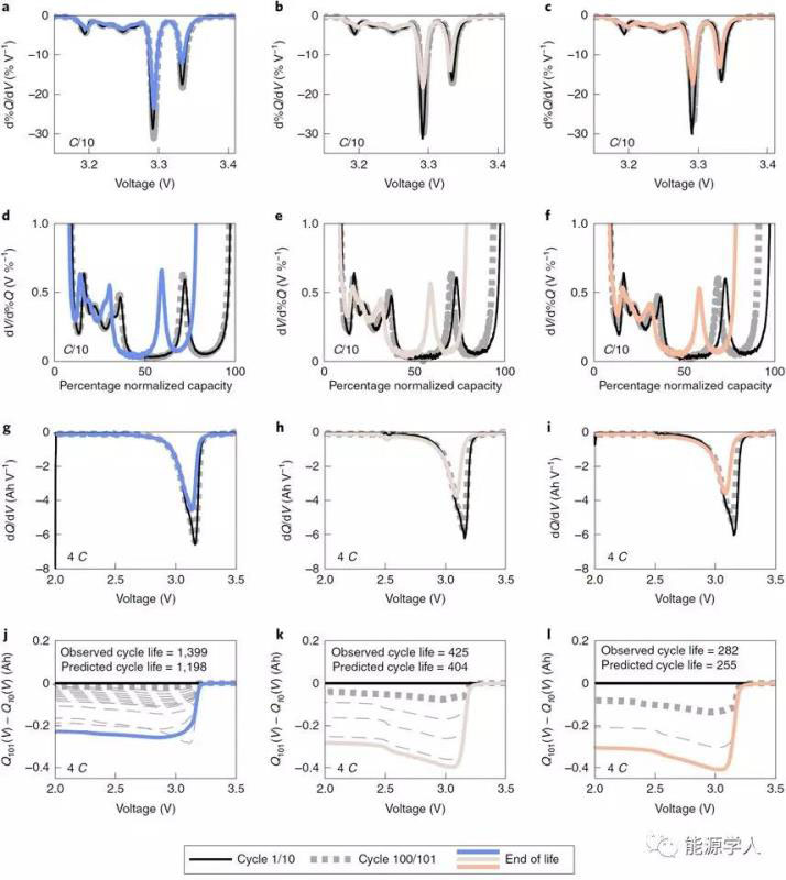 通過上述數(shù)據(jù),作者認(rèn)為,從早期循環(huán)放電電壓曲線得出的特征,對(duì)電池循環(huán)壽命具有良好的預(yù)測(cè)性能,甚至在容量衰減開始之前就可以可靠預(yù)測(cè)。作者將出現(xiàn)在放電電壓曲線中的退化模式與接近壽命結(jié)束時(shí)的快速容量衰減聯(lián)系起來,使這一觀察結(jié)果更合理化。