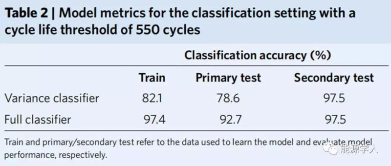 為了適應(yīng)工業(yè)規(guī)模,作者還在非常低的循環(huán)圈數(shù)下,對(duì)循環(huán)壽命進(jìn)行預(yù)測(cè),盡管在這種情況下精度可能有些許偏差。作者開發(fā)了一個(gè)邏輯回歸模型,將電池分為“低壽命”或“高壽命”組,只使用前五個(gè)循環(huán)圈數(shù)的數(shù)據(jù)對(duì)整體電池壽命進(jìn)行預(yù)測(cè)。對(duì)于“方差”模型,作者僅使用第四和第五個(gè)周期之間的ΔQ5-4(V),獲得88.8%的預(yù)測(cè)精度。對(duì)于“完整”模型,作者使用具有18個(gè)候選特征的邏輯回歸,以達(dá)到95.1%的預(yù)測(cè)精度。以上結(jié)果在上表中進(jìn)行匯總,可以看出,該邏輯回歸手段說明了ΔQ(V)的預(yù)測(cè)能力,即使只使用前幾個(gè)周期的數(shù)據(jù),也能預(yù)測(cè)電池的循環(huán)壽命。