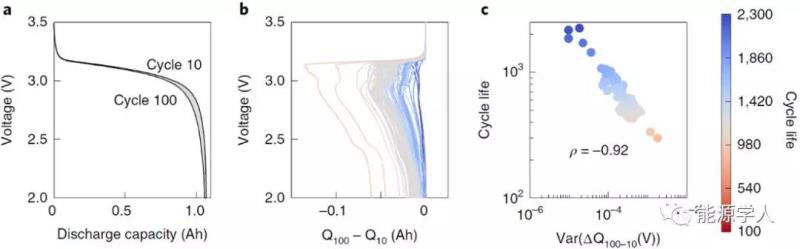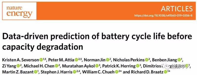 KristenA. Severson, Peter M. Attia, Norman Jin, Nicholas Perkins, Benben Jiang, ZiYang, Michael H. Chen, Muratahan Aykol, Patrick K. Herring, Dimitrios Fraggedakis, Martin Z. Bazant, Stephen J. Harris, William C. Chueh & Richard D. Braatz, Data-driven prediction of battery cycle life before capacity degradation, Nature Energy, 2019, DOI:10.1038/s41560-019-0356-8