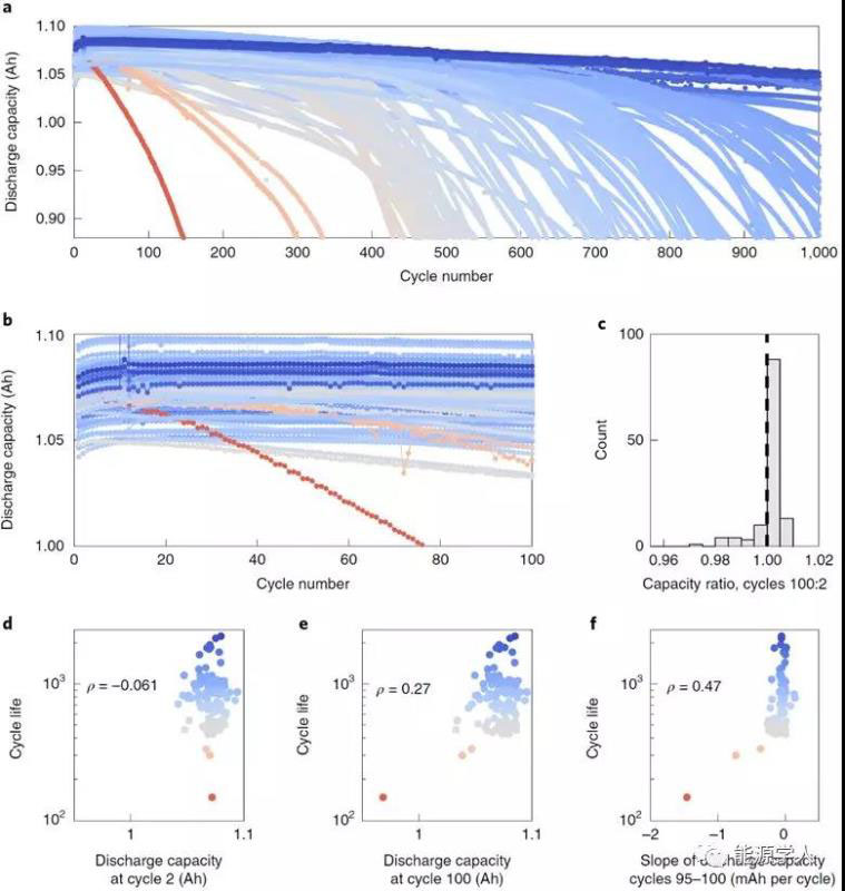 上圖a,b表示電池在前1000個(gè)循環(huán)中的放電容量,可以看到,在最初的100個(gè)循環(huán)中,容量衰減可以忽略不計(jì),但是隨著時(shí)間的增加,容量衰減開始加速,正如我們經(jīng)常在電子產(chǎn)品中觀察到的那樣。容量衰減的軌跡交叉說明了初始容量與循環(huán)壽命之間的弱關(guān)系,比如第二個(gè)循環(huán)(相關(guān)性ρ=?0.06,圖d)和第100個(gè)循環(huán)(ρ=0.27,圖e)的循環(huán)壽命對(duì)數(shù),與第100個(gè)循環(huán)(ρ=0.47,圖f)附近的容量衰減率之間存在很弱的相關(guān)性。由于容量衰減曲線中的相關(guān)性很弱,因此其預(yù)測(cè)能力有限。作者隨后采用了一種新的數(shù)據(jù)驅(qū)動(dòng)方法,該方法考慮了更大的循環(huán)數(shù)據(jù),包括每個(gè)循環(huán)的全電壓曲線,以及電池內(nèi)阻和溫度等附加測(cè)量。