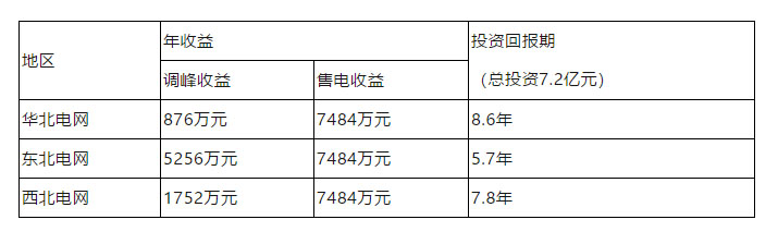同樣以橋?yàn)匙冸娬?20MW/240MWh獨(dú)立儲(chǔ)能電站為例,假設(shè)一天參與兩次調(diào)峰,且儲(chǔ)存的電量在用電高峰時(shí)段按照風(fēng)電上網(wǎng)電價(jià)賣出(按0.5元/kWh計(jì)算),充放電效率90%,一年按365天計(jì)算,則不同地區(qū)的收益情況如下表: