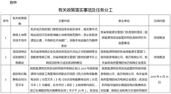 六、協(xié)同落實(shí)支持風(fēng)電、光伏發(fā)電平價(jià)上網(wǎng)政策措施。各省(區(qū)、市)發(fā)展改革委(能源局)要抓緊組織風(fēng)電、光伏發(fā)電平價(jià)上網(wǎng)項(xiàng)目建設(shè)工作,會(huì)同地方各級(jí)政府部門(mén)落實(shí)降低項(xiàng)土地相關(guān)成本有關(guān)政策要求。國(guó)家電網(wǎng)公司、南方電網(wǎng)公司及有關(guān)省級(jí)政府管理的地方電網(wǎng)企業(yè)做好有關(guān)平價(jià)上網(wǎng)項(xiàng)目的電力送出和消納落實(shí)工作,規(guī)范簽訂長(zhǎng)期固定電價(jià)購(gòu)售電合同(不少于20年)。國(guó)家發(fā)展改革委、國(guó)家能源局將加強(qiáng)對(duì)有關(guān)平價(jià)上網(wǎng)項(xiàng)目政策落實(shí)的指導(dǎo)和督促。有關(guān)政策落實(shí)事項(xiàng)及任務(wù)分工見(jiàn)附件。