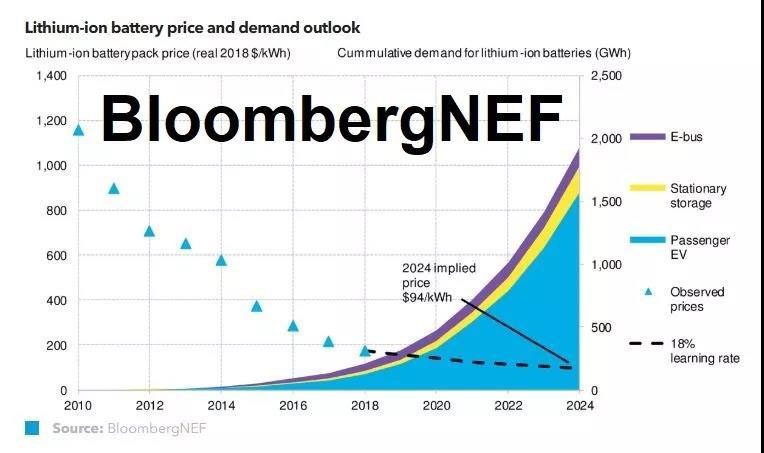 按照這一學(xué)習(xí)速率,至2024年,鋰離子電池組的價格將低于100美元/kWh.