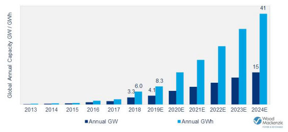 這是調(diào)Wood Mackenzie公司日前發(fā)布的名為“2019年全球儲能展望:2018年回顧和2024年展望”的調(diào)查報告所描繪的發(fā)展前景。該報告預(yù)測,未來6年,全球儲能部署將增長13倍,將從2018年的12 GWh增長到2024年的158GWh。