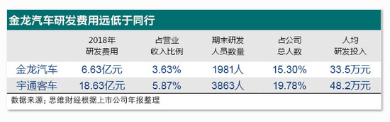 由此看來,自身產(chǎn)品競爭力不足、長年依賴補貼,或是公司盈利水平較低的更深層次原因。事實上,金龍汽車研發(fā)費用投入在行業(yè)內(nèi)一直處于中等水平,遠低于競爭對手宇通客車,以2018年年報為例,2018年金龍汽車研發(fā)費用6.63億,人均研發(fā)投入約為33.5萬元;同期宇通客車研發(fā)費用為18.63億,人均研發(fā)投入約為48.2萬元。