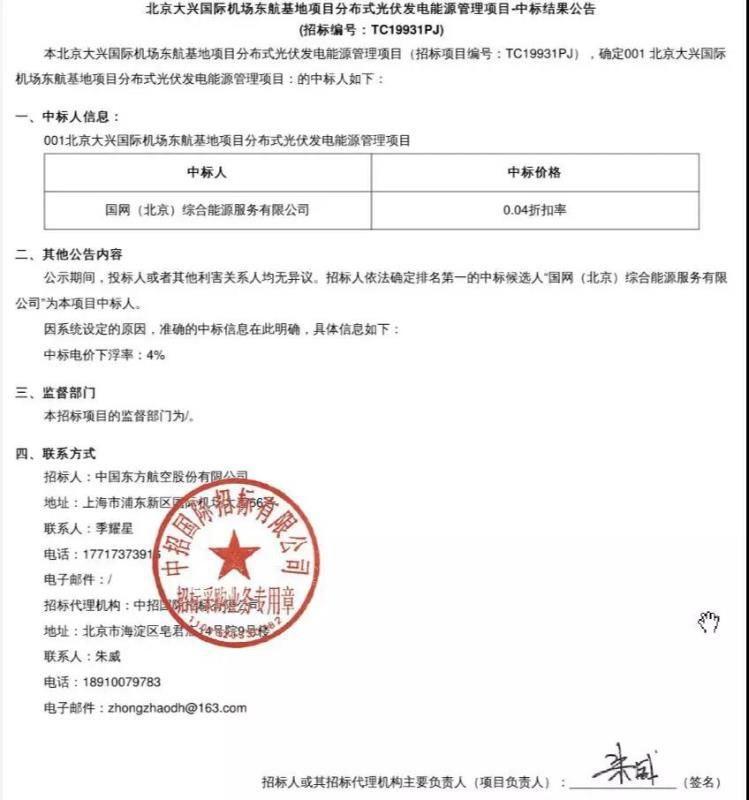 中國儲能網(wǎng)訊:4月23日,北京大興國際機(jī)場東航基地項(xiàng)目分布式光伏發(fā)電能源管理項(xiàng)目中標(biāo)結(jié)果公告發(fā)布。國網(wǎng)(北京)綜合能源服務(wù)有限公司以第一中標(biāo)候選人的成績中標(biāo)。