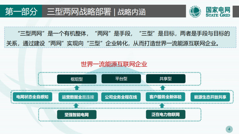 “三型兩網(wǎng)”:“三型”是國(guó)網(wǎng)公司提出的戰(zhàn)略目標(biāo),樞紐型、平臺(tái)型、服務(wù)型,樞紐型就是我們打造以電為核心的能源消費(fèi)模式,平臺(tái)核心就是我們打造綜合能源的平臺(tái),服務(wù)型就是打造供應(yīng)的生態(tài)圈。“兩網(wǎng)”就是能源互聯(lián)網(wǎng)、一個(gè)就是泛在電力物聯(lián)網(wǎng)。