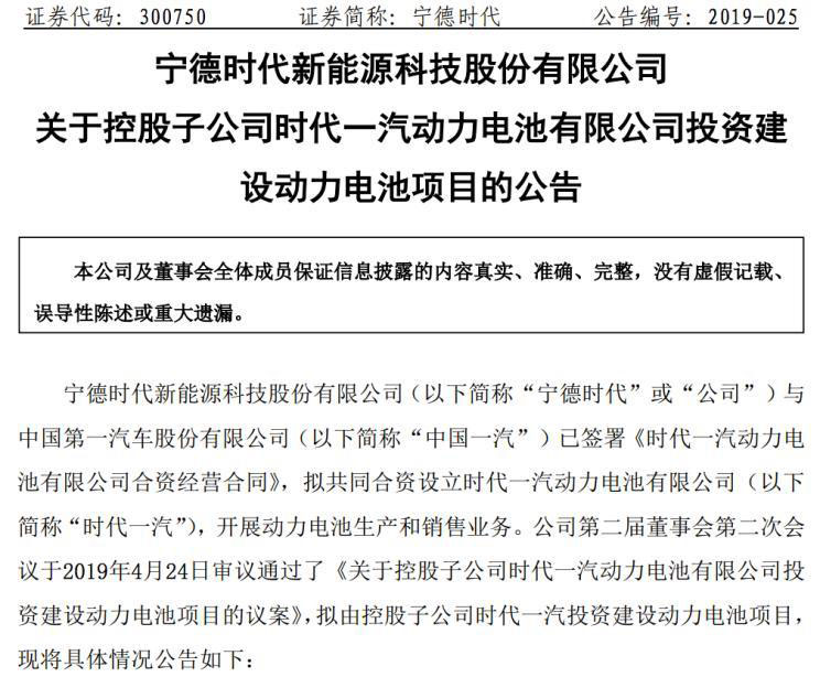 4月25日,動(dòng)力電池企業(yè)寧德時(shí)代新能源科技股份有限公司(簡(jiǎn)稱“寧德時(shí)代”)發(fā)布公告表示,公司與中國(guó)第一汽車股份有限公司(簡(jiǎn)稱“中國(guó)一汽”)已簽署《時(shí)代一汽動(dòng)力電池有限公司合資經(jīng)營(yíng)合同》,擬共同合資設(shè)立時(shí)代一汽動(dòng)力電池有限公司(簡(jiǎn)稱“時(shí)代一汽”),開展動(dòng)力電池生產(chǎn)和銷售業(yè)務(wù)。