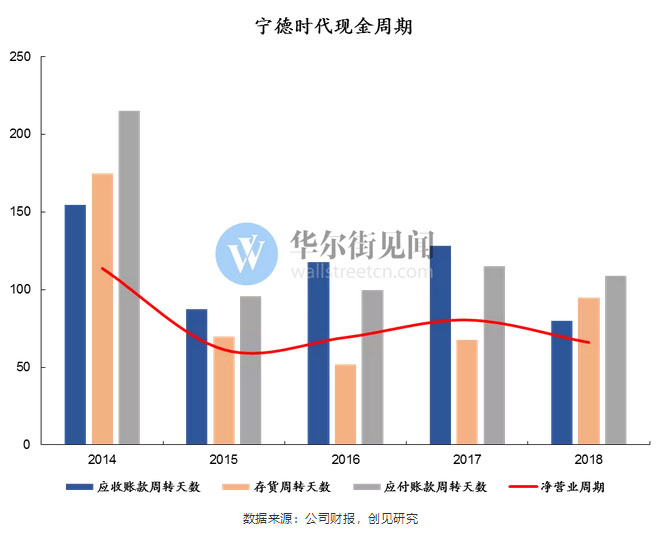 進(jìn)一步拆解現(xiàn)金周期(凈營(yíng)業(yè)周期)來(lái)看,寧德時(shí)代的應(yīng)收賬款周轉(zhuǎn)天數(shù)相對(duì)平穩(wěn),2018年甚至逆勢(shì)出現(xiàn)下降;應(yīng)付賬款周轉(zhuǎn)天數(shù)自2015年以來(lái)也呈上升趨勢(shì),顯示其與供應(yīng)商的信任程度不斷加深。唯一美中不足的是存貨 周轉(zhuǎn)天數(shù)的增長(zhǎng),但對(duì)一家銷量呈指數(shù)增長(zhǎng)的公司來(lái)說(shuō),一定程度的存貨堆積無(wú)傷大雅。