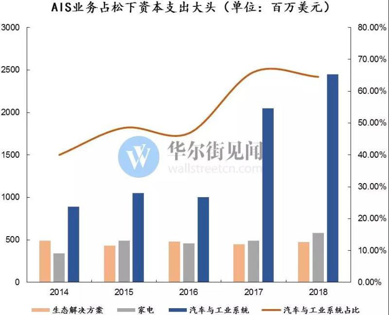 從投入的角度看,松下對(duì)AIS業(yè)務(wù)可謂揮金如土。2017年,AIS業(yè)務(wù)資本支出一度接近公司總資本支出的70%;而在去年,AIS系統(tǒng)的資本支出再創(chuàng)新高,這其中的一大部分,以特斯拉超級(jí)工廠為代表的固定資產(chǎn)投資與相關(guān)折舊的形式,投向了二次電池隸屬的能源分支。