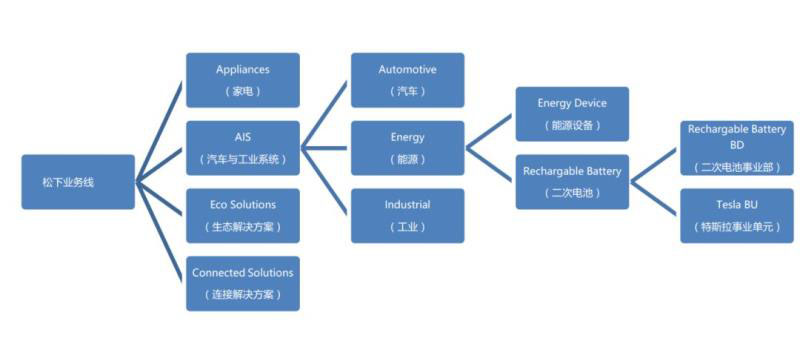 在松下如今的四大業(yè)務(wù)中,二次電池隸屬于AIS(汽車與工業(yè)系統(tǒng))的能源業(yè)務(wù)分支,旗下又細(xì)分為二次電池事業(yè)部與特斯拉事業(yè)單元兩大部門。