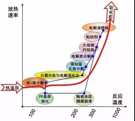 熱失控是鋰電池危害程度最高且難以預(yù)測的風(fēng)險(xiǎn),當(dāng)電芯受到外力破壞引起短路或內(nèi)部發(fā)生短路、過充情況時(shí),電芯內(nèi)部的溫度便隨之上升,一旦升至130度,SEI膜便開始崩解,并造成有機(jī)電解液直接與高活性正負(fù)極接觸,因而大量發(fā)生分解放熱反應(yīng),導(dǎo)致溫度與內(nèi)壓提速上升、大量氣體產(chǎn)生造成電池快速膨脹,到達(dá)臨界溫度后正極崩解,釋放出更多熱能及氧氣,諸多因素迭加后造成升溫、分解、放熱的連鎖反應(yīng)加劇,終至起火爆炸。
