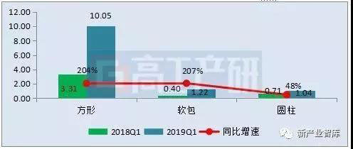 從不同電池形狀來看,2019年第一季度方形電池裝機電量約10.05GWh,同比增長204%;軟包電池裝機電量約1.22GWh,同比增長207%;圓柱電池裝機電量約1.04GWh,同比增長48%。