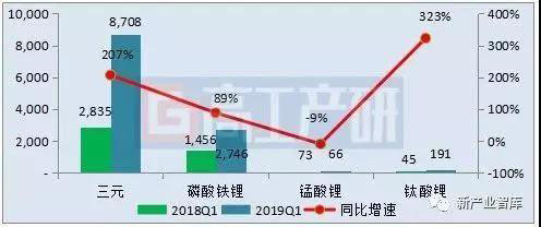 從不同電池類型來看,2019年第一季度磷酸鐵鋰電池裝機電量約2.75GWh,同比增長89%;三元電池裝機電量約8.71GWh,同比增長207%;鈦酸鋰電池裝機電量約191MWh,同比增長323%;錳酸鋰電池裝機電量約66MWh,同比下降9%。