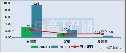 從車輛細分類別來看,2019年第一季度新能源乘用車電池裝機電量約9.53GWh,同比增長216%;客車電池裝機電量約2.21GWh,同比增長100%;專用車電池裝機電量約0.58GWh,同比增長97%。