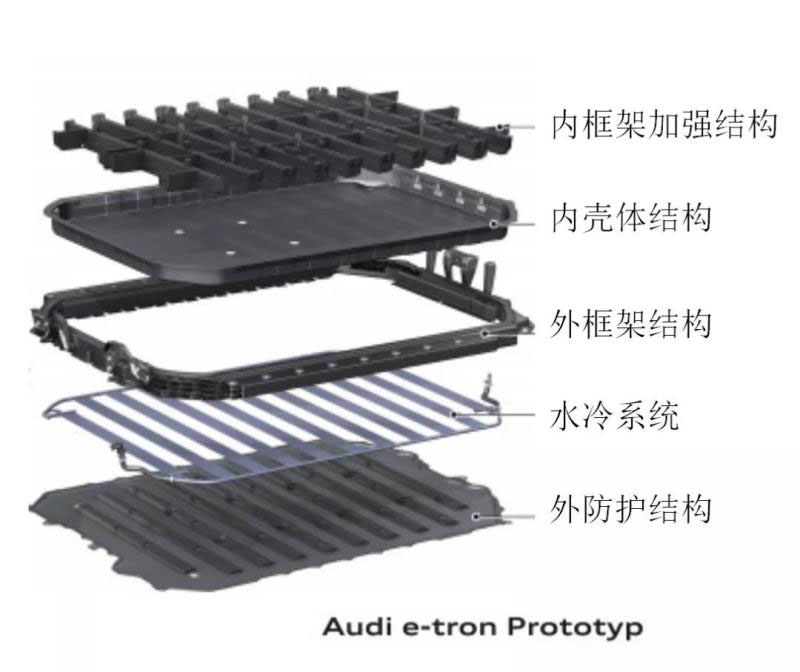 這種結(jié)構(gòu)的托盤,框架結(jié)構(gòu)特點不明顯,但是,整體強度可以滿足電池承截要求。常見于小能量電池系統(tǒng)結(jié)構(gòu)。如下圖的Audi A3壓鑄托盤。
