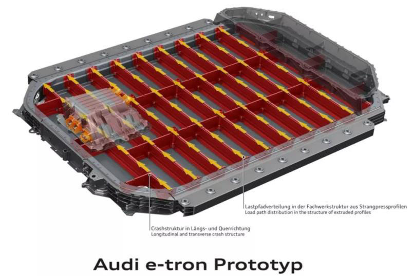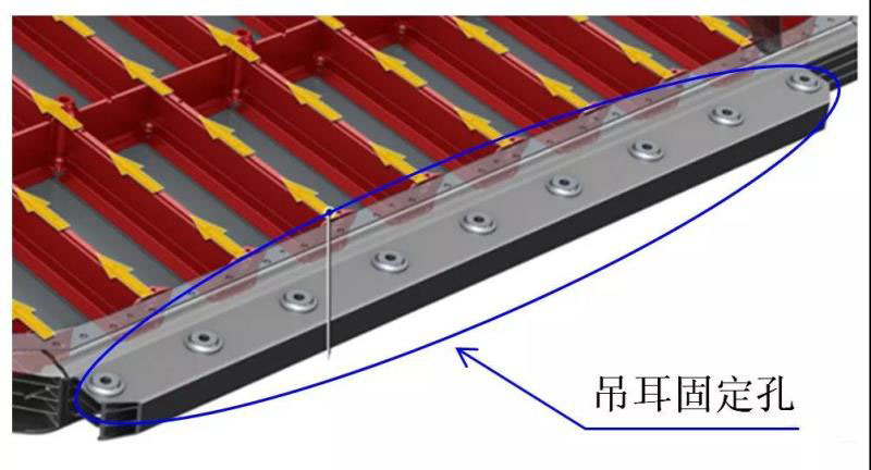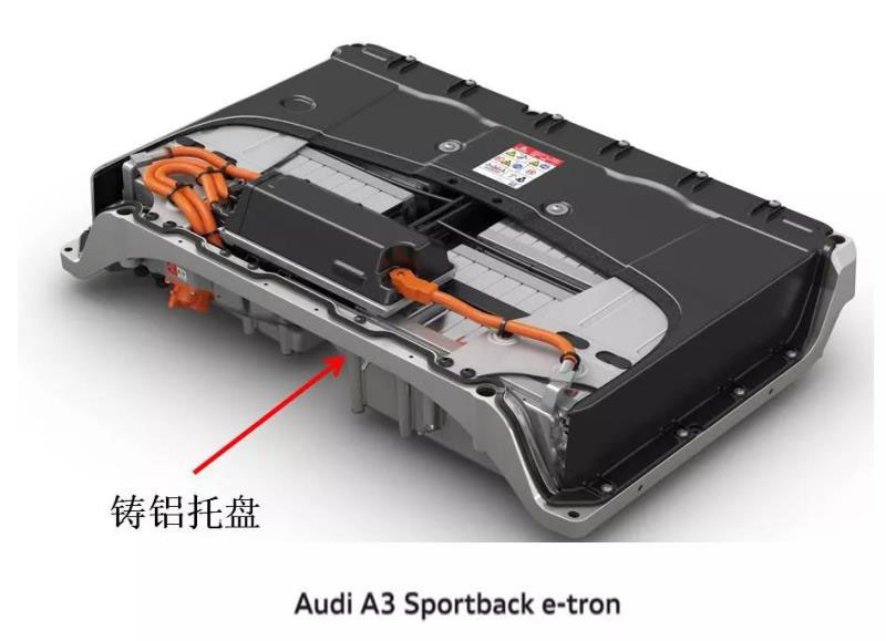 托盤的鋁制吊耳固定點應(yīng)數(shù)量多,而且布置均勻,如下圖奧迪 e-tron鋁托盤案例所示。