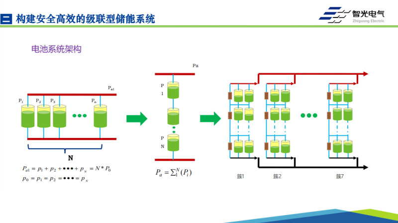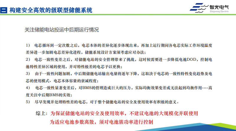 在整個級聯(lián)儲能系統(tǒng)開發(fā)研制過程中,我們加入了一個電池簇的功率控制技術(shù)。大家都知道,在我們現(xiàn)有的第一儲能技術(shù)路線里頭,我們的單個電池包都是有很多簇的電池來組成的,這個電池包共用的是同一臺PCS,比如大家常見的500千瓦或者600千瓦的PCS,當(dāng)通過PCS把交流的功率注入到這樣的電池包里的時候,這個功率電流在不同的電池簇之間進(jìn)行分配的時候,依靠的僅僅是直流系統(tǒng)、電池系統(tǒng)它的內(nèi)部的電阻來進(jìn)行的分配,內(nèi)部是不可控的,內(nèi)部是不可控的情況下就會導(dǎo)致大家的出力會有差異。在前期的時候,在新電池的時候,大家的內(nèi)阻,通過我們成Pack的時候進(jìn)行電芯篩選、Pack的一些工藝控制,在新電芯的時候我們可以控制的相對比較好,不會有特別突出的問題,這個時候是可以使用的。但是我們使用的時間長了以后,大家都知道這個參數(shù)肯定是會離散的,這個是不可避免的,因?yàn)槎贾牢覀円粋€集裝箱里頭溫差是比較大的,差個7、8度可能都會比較常見,老化速度是不一樣的,內(nèi)阻會離散的,我們設(shè)計一個電池系統(tǒng)新的我們按照500千瓦工作沒有問題,運(yùn)行2年以后安全的工作是我們需要考慮的問題。
