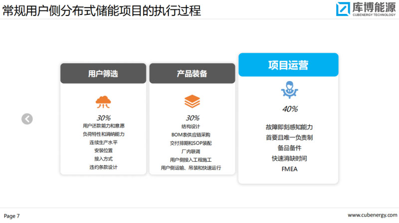 對(duì)于一個(gè)常規(guī)的分布式儲(chǔ)能項(xiàng)目的開發(fā),從庫(kù)博能源的角度看分成了3個(gè)階段,分別是用戶篩選,產(chǎn)品裝備,以及項(xiàng)目運(yùn)營(yíng)。我對(duì)這三個(gè)階段分別列了權(quán)重,分別是30%,30%和40%,每個(gè)階段都有很明確的任務(wù),和關(guān)注要點(diǎn)。要想讓一個(gè)項(xiàng)目能夠執(zhí)行成功,每個(gè)步驟都不能省略和偷懶。用戶篩選決定了一個(gè)項(xiàng)目是否具備可投資價(jià)值,產(chǎn)品裝備決定了一個(gè)項(xiàng)目是否能夠輸出盈利能力,而項(xiàng)目運(yùn)營(yíng)決定了一個(gè)項(xiàng)目能否長(zhǎng)期產(chǎn)生持續(xù)現(xiàn)金流,每個(gè)條件都只是必要條件,但是三個(gè)條件合在一起就成了項(xiàng)目成功執(zhí)行的充分必要條件。用戶側(cè)最核心的問(wèn)題是現(xiàn)階段國(guó)內(nèi)用戶側(cè)的應(yīng)用場(chǎng)景太少,能賺錢的常規(guī)路徑只有一條峰谷轉(zhuǎn)移,不像在歐美可以PDS最大需量削減,ADR需求側(cè)響應(yīng),VPP虛擬電廠,AUX容量輔助服務(wù)等等,這些豐富的場(chǎng)景為用戶找到了很多盈利的路線。反觀國(guó)內(nèi),賺錢的地方少,而花錢的地方多,造成成本季度敏感,用戶篩選和過(guò)濾也是極度風(fēng)險(xiǎn)規(guī)避,這是我們大家正在面臨的問(wèn)題。當(dāng)然我們也希望將這些問(wèn)題轉(zhuǎn)化為動(dòng)力,真正為用戶服務(wù),為電力系統(tǒng)服務(wù)。