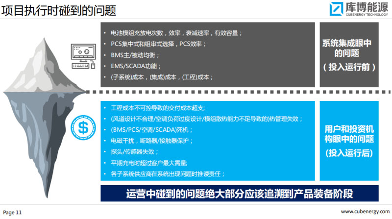 電池模組充放電次數(shù)、效率、衰減速率、有效容量、PCS集中式和組串式選擇,BMS主被動(dòng)均衡,EMS、CSADA功能,最后是成本!成本!成本!所以我們開始的時(shí)候投入運(yùn)行前考慮的問(wèn)題,事實(shí)上是技術(shù)的問(wèn)題,投入運(yùn)行后會(huì)發(fā)現(xiàn)哪些問(wèn)題呢,開個(gè)玩笑說(shuō)都是雞毛蒜皮的事情,可能一個(gè)傳感器1.8毛錢,影響2天、3天的時(shí)間,造成的收益損失高達(dá)1萬(wàn)、2萬(wàn),這些問(wèn)題都不是我們前面看到的,都是運(yùn)行的時(shí)候看到的,電池干擾、短路器、接觸器保護(hù)、探頭、傳感器失效,平期充電時(shí)超過(guò)客戶最大需量,各子系統(tǒng)供應(yīng)商在系統(tǒng)出現(xiàn)問(wèn)題時(shí)推諉責(zé)任,集成的過(guò)程中投入運(yùn)行后我們會(huì)發(fā)現(xiàn)有各式各樣的問(wèn)題。我們目前總結(jié)和定義來(lái)說(shuō),運(yùn)營(yíng)中碰到的問(wèn)題絕大部分應(yīng)該追溯到產(chǎn)品裝備的階段。