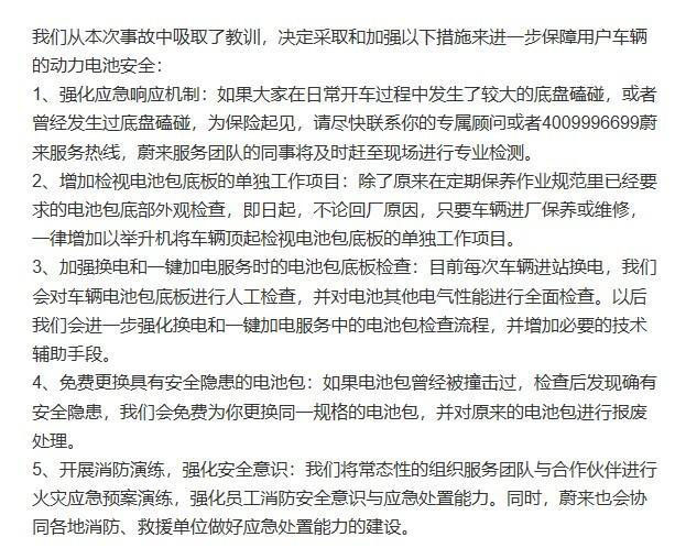 5.開展消防演練,強化安全意識:蔚來汽車將強化員工消防安全意識與應(yīng)急處置能力,同時,蔚來汽車還會協(xié)同各地消防、救援單位做好應(yīng)急處置能力的建設(shè)。不過針對以上措施,車主是否需要付費,蔚來汽車尚未明確說明。