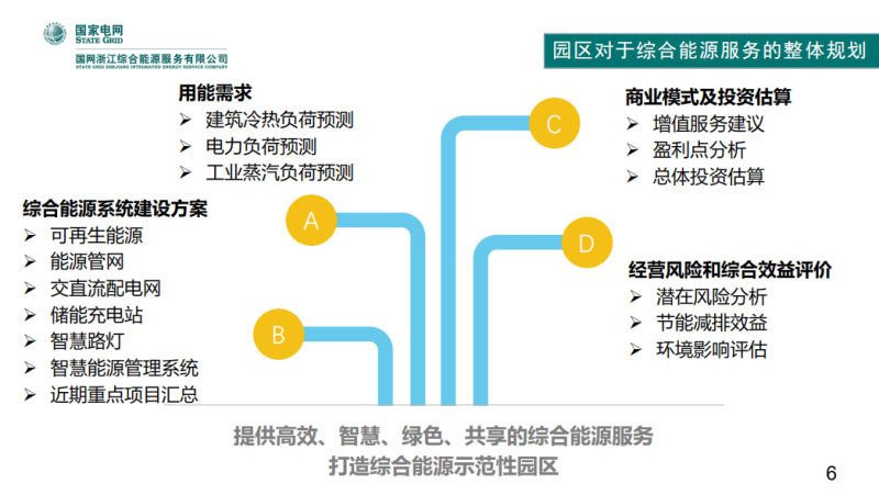 結(jié)合園區(qū)需求,目前國(guó)網(wǎng)浙江綜合能源公司開展了一些基于園區(qū)的綜合能源項(xiàng)目。我們目前開展綜合能源業(yè)務(wù)的重心首先是著眼于園區(qū);第二個(gè)就是融合泛在電力物聯(lián)網(wǎng)的建設(shè),看看能為園區(qū)提供哪些服務(wù)價(jià)值。這張圖就是我們目前做的一個(gè)項(xiàng)目,對(duì)于一個(gè)園區(qū)做的一些工作。我們首先去了解園區(qū)的需求,包含建筑冷熱負(fù)荷預(yù)測(cè)、電力負(fù)荷預(yù)測(cè)、工業(yè)蒸汽負(fù)荷預(yù)測(cè)。接下來為園區(qū)做一個(gè)園區(qū)級(jí)的綜合能源系統(tǒng)規(guī)劃建設(shè)方案,其中包括可再生能源的建設(shè);能源管網(wǎng)的建設(shè)和規(guī)劃;交直流配電網(wǎng)的建設(shè);儲(chǔ)能站、智慧路燈、智慧能源管理系統(tǒng)。在規(guī)劃方案中,我們還會(huì)做一個(gè)商業(yè)模式和投資估算,包括增值服務(wù)建議、盈利點(diǎn)分析、總體投資預(yù)算,最后對(duì)經(jīng)營(yíng)風(fēng)險(xiǎn)和綜合效益做一個(gè)評(píng)價(jià)。目的是為了打造一個(gè)示范園區(qū)。