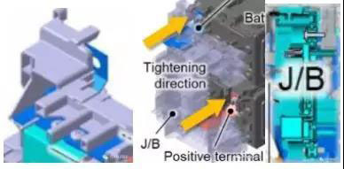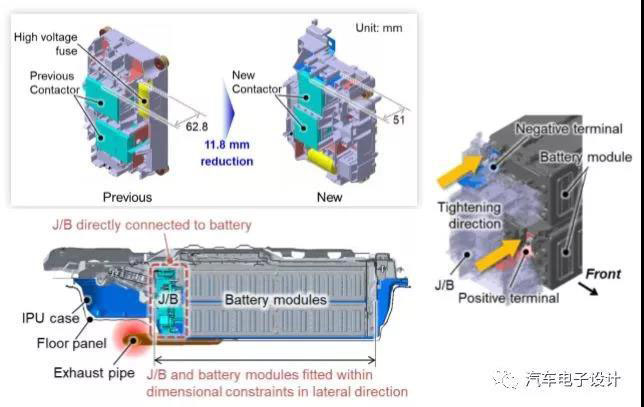 配電盒和電池模組的連接方式,可以通過(guò)更有效的電氣連接方式進(jìn)行連接,如下圖所示,這里的英文原文為direct connection of J/B and battery modules,我們可以理解為直接兩個(gè)正負(fù)極柱直接懟上去了。