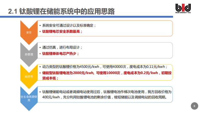 第三個(gè),經(jīng)濟(jì)性。以前我們沒有把動(dòng)力電池和儲能電池嚴(yán)格區(qū)分開來,現(xiàn)在我們按應(yīng)用需求提供不同功能的產(chǎn)品,從而更好的推廣鈦酸鋰電池的應(yīng)用。鈦酸鋰電池應(yīng)用的瓶頸主要是價(jià)格方面,比如動(dòng)力電池鈦酸鋰的要求高,價(jià)格昂貴,現(xiàn)在大概是4500元/度,可以使用4萬次,度電成本是0.11元/千瓦時(shí),但是初期成本太高,除了在一些不得不用它的場合,比如軌道交通場合,人家只敢用鈦酸鋰電池,不敢使用磷酸鐵鋰,其他場合,大家想用也沒法盈利。如果在儲能領(lǐng)域使用動(dòng)力型的鈦酸鋰電池,沒有企業(yè)會接受,所以我們公司針對這個(gè)市場推出了我們動(dòng)力儲能型的鈦酸鋰電池。現(xiàn)在我們的儲能用鈦酸鋰電池可以達(dá)到2千元/度電,可以使用1萬次,是在1C充放的情況下,度電成本是0.2元/瓦時(shí),和動(dòng)力電池比起來,它的初期投資成本會偏低一些。