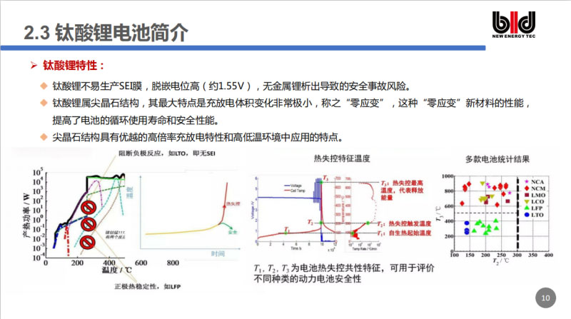 大家都在說鈦酸鋰為什么安全。材料本身來講非常安全。我們負(fù)極采用的是鈦酸鋰,鈦酸鋰的脫嵌電位高約1.55V,不易生產(chǎn)SEI膜,沒有金屬鋰析出導(dǎo)致的安全風(fēng)險(xiǎn)。鈦酸鋰屬于尖晶石結(jié)構(gòu),充放電過程中晶體結(jié)構(gòu)的體積變化非常小。一般來說,因?yàn)槲覀冇蠸EI膜,所以在我電池風(fēng)險(xiǎn)控制鏈條反應(yīng)中,SEI膜和負(fù)極反應(yīng)不存在,引發(fā)的安全風(fēng)險(xiǎn)性就非常小。這個(gè)圖就是通過加速測試來測得的,我們發(fā)生各種電池的熱失控觸發(fā)溫度、熱失控的最高溫度,可以看到鈦酸鋰的溫度是非常低的,它也是非常安全的。