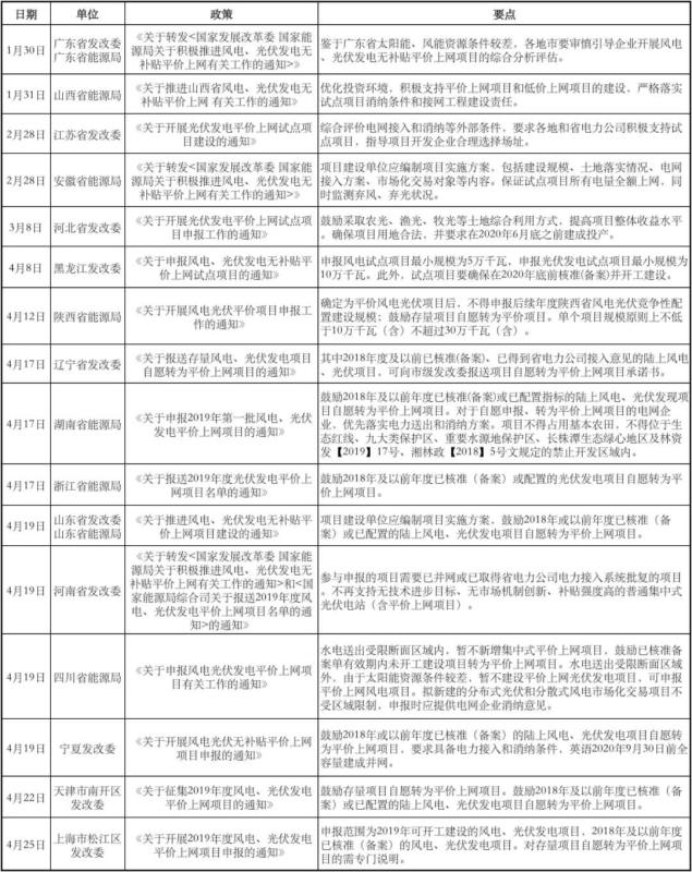 回望2018年中國儲能產(chǎn)業(yè)的發(fā)展,電網(wǎng)側(cè)與用戶側(cè)的裝機容量都實現(xiàn)了飛躍增長。2019年,新政的下發(fā)為行業(yè)發(fā)展指明了平價上網(wǎng)的方向,同時也為儲能行業(yè)帶來新的機遇。在《關(guān)于積極推進風電、光伏發(fā)電無補貼平價上網(wǎng)有關(guān)工作的通知》、《關(guān)于報送2019年度風電、光伏發(fā)電平價上網(wǎng)項目名單的通知》等政策文件的號召之下,全國各地平價上網(wǎng)項目申報工作迅速火熱展開。據(jù)不完全統(tǒng)計,目前已有十幾個省市發(fā)布了平價上網(wǎng)項目申報的政策。
