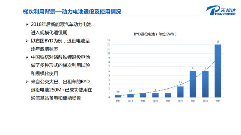 使用情況,重點(diǎn)是中國鐵塔,它從2015、2016年做了多種形式梯次利用的試驗(yàn),包括在通信基站有規(guī)模化的商用,也是以比亞迪為例,比亞迪應(yīng)該在2018年就交了超過250兆瓦時(shí)的梯次電池,應(yīng)用于鐵塔的通信基站中。