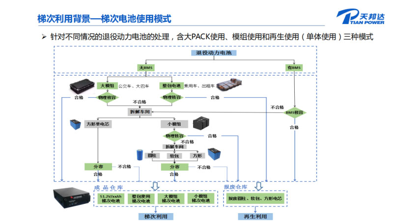 我們?cè)倏匆幌绿荽坞姵厥褂玫囊恍┠J剑驗(yàn)橹饕€是我們結(jié)合中國鐵塔的一些使用模式來講,可能不是太全。中國鐵塔目前主要是推三種模式,也就是退役的汽車動(dòng)力的Pack包,首先做一個(gè)物理核容,如果這個(gè)物理核容直接符合Pack去使用,后續(xù)就應(yīng)用于相關(guān)的一些直接Pack使用的應(yīng)用場(chǎng)景。如果核容是不滿足直接使用場(chǎng)景情況下會(huì)再做一些拆解,這里面有兩種情況,一種情況是這個(gè)Pack包本身由方形的大電池組成,所以直接對(duì)方形的電池包進(jìn)行分容、配組,最后形成一個(gè)像通信基站可以直接使用的電池包直接使用,這種我們稱之為單體使用模式。還有一些廠家,比如像比亞迪的電池,它會(huì)采用模組化的方式,可能在它當(dāng)初設(shè)計(jì)Pack的時(shí)候就考慮到將來的梯次利用方式。所以模組被拆下來的時(shí)候,經(jīng)過物理核容,如果直接能達(dá)到模組的使用要求,就進(jìn)入到模組使用的模式。