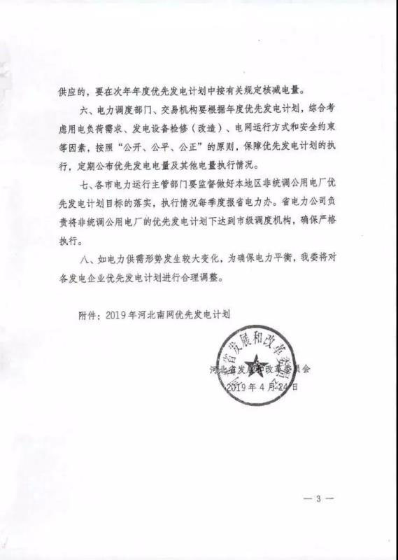 近日,河北發(fā)改委下發(fā)《關(guān)于下達(dá)2019年河北南網(wǎng)優(yōu)先發(fā)電計劃的通知》提出,風(fēng)電、光伏、生物質(zhì)等非水可再生能源以及煤矸石、余熱、余氣、余壓等綜合利用機(jī)組按照資源量、水電機(jī)組按照“以水定電”原則安排優(yōu)先發(fā)電計劃,全部執(zhí)行政府定價。