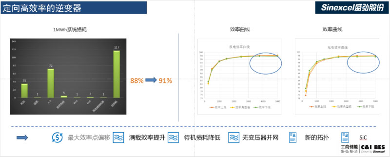第一、儲(chǔ)能逆變器PCS,PCS的未來發(fā)展我們起個(gè)名字叫“定向高效率的儲(chǔ)能逆變器”,什么叫定向高效率呢?是比照之前我們做光伏逆變器或者做變頻做的事情,以前的光伏逆變器我們宣稱的效率基本上是最大的效率,無論是99%也好,還是UPS的96%也好。而到了儲(chǔ)能以后更多的是能量效率,峰值效率意義不大了。下方左圖可以看出來,1兆瓦的儲(chǔ)能系統(tǒng),逆變器損耗的占比是很大的,未來的儲(chǔ)能逆變器朝著定向高效率,滿載效率一定要高,以后PCS可能就是滿載效率,二是空載損耗降到足夠低,才能使系統(tǒng)運(yùn)行綜合的能量效率最高。采用的技術(shù),未來會(huì)采取新的電路拓?fù)浜托碌钠骷蓟?,也在探討一些用戶?cè)的儲(chǔ)能項(xiàng)目上把變壓器去掉,綜合提升一個(gè)定向的效率,這是未來PCS的一個(gè)發(fā)展方向。