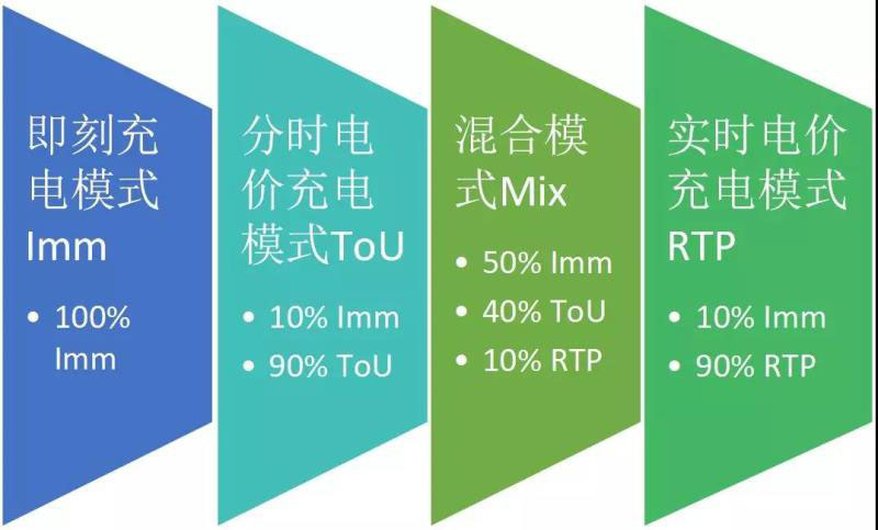 電動車充電模式可分為四種:即刻充電模式(Immediatescenario,Imm)、分時電價充電模式(Time-of-use,ToU)、實時電價充電模式(RealtimePrice,RTP)和混合充電模式(Mix)。即刻充電模式也就是電動車什么時候到什么時候充電的模式,是一種隨意行為模式。分時電價充電模式和實時電價充電模式則運用了電價激勵措施改變了人們的充電行為。分時電價充電模式將引導(dǎo)人們按照靜態(tài)的固定價格表在時間允許范圍內(nèi)最低電價時充電。實時電價充電模式將按照隨每小時不停變化的實時電價引導(dǎo)人們在時間允許范圍內(nèi)最低電價時充電。在實際運行過程中,考慮到電動車必須在到達充電樁和離開充電樁之間充電,分時電價充電模式和實時電價充電模式下,仍然會有即刻充電的存在。