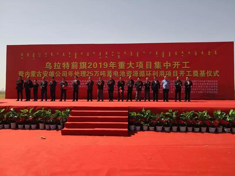 5月15日,巴彥淖爾市烏拉特前旗2019年重大項(xiàng)目集中開工暨內(nèi)蒙古安雄環(huán)??萍加邢薰灸晏幚?5萬(wàn)噸蓄電池資源循環(huán)利用基地項(xiàng)目奠基儀式在烏拉特前旗工業(yè)園區(qū)隆重舉行。