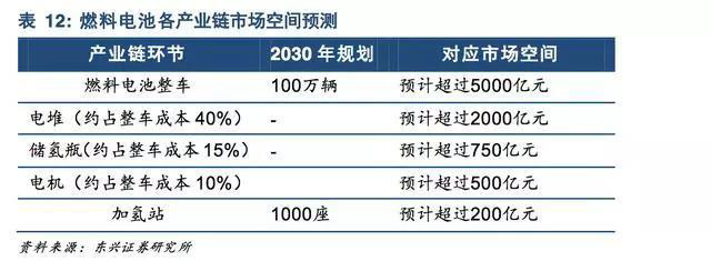 國內(nèi)2030年燃料電池汽車商業(yè)推廣計劃超過100萬輛,預計對應(yīng)市場空間超過5000億元。按照電堆成本占比40%,儲氫瓶成本占比15%,電機成本占比10%計算,預計2030年國內(nèi)燃料電池電堆、儲氫瓶、電機對應(yīng)市場空間分別超過2000億元、750億元和500億元。