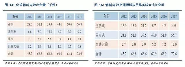 從全球燃料電池出貨量來看,近年來呈穩(wěn)步提升態(tài)勢。2017年全球燃料電池出貨量達到7.26萬件,其中大部分為固定式(主要為燃料電池固定發(fā)電)應(yīng)用,車輛領(lǐng)域成長迅速,有望成為未來主流的應(yīng)用場景。